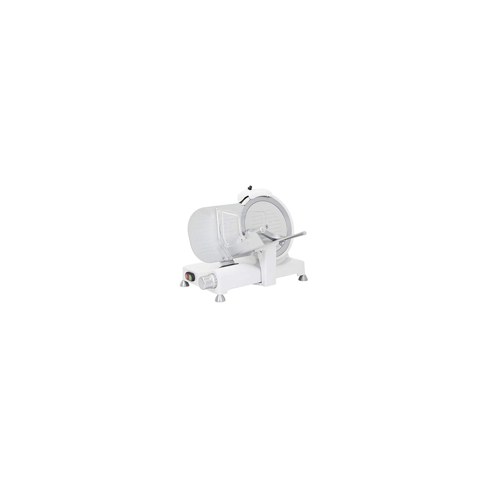 R.G.V. LUXURY25/WHT. Affettatrice 140 Watt di potenza - Realizzata in alluminio fuso con base laccata, coprilama, piatto e paratia in alluminio fuso stampato - Pressamerce con ciabatta in tritan removibile e lavabile - Sistema Easy Clean: piatto inclinabile (5 cm) per una rapida pulizia della zona di taglio - Albero portalama su doppio cuscinetto - Motore di tipo professionale ventilato, lama professionale temperata di terza generazione, anello fisso di protezione della lama, affilatoio fisso - Spessore massimo di taglio 16mm - Diametro lama 250mm - Corsa carrello: 235 mm - ZERO SPESE PAYPAL - SPEDIZIONE GRATUITA