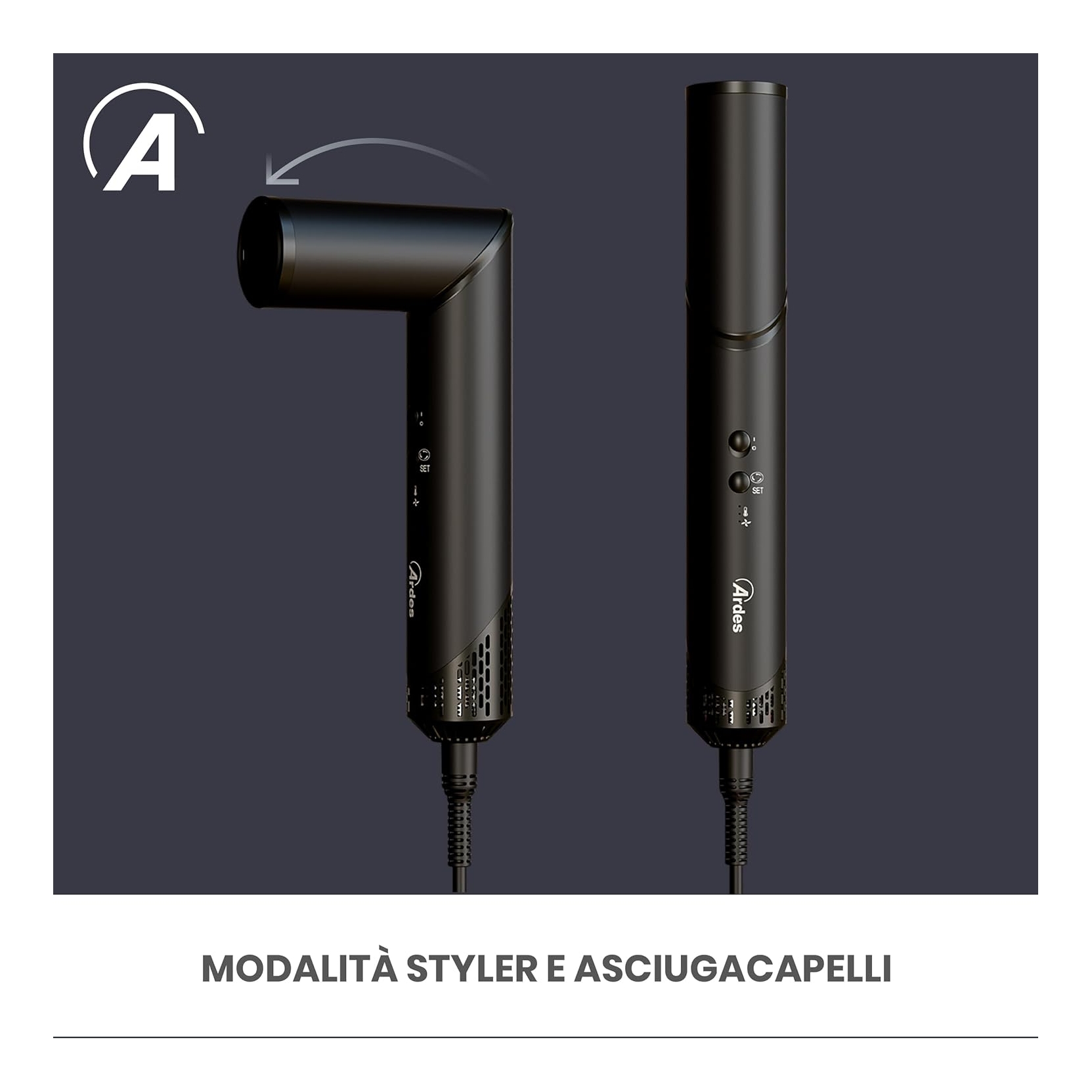 Estylia può essere utilizzato come classico phon ruotando la bocchetta in alto, per un’impugnatura pratica e comoda.
