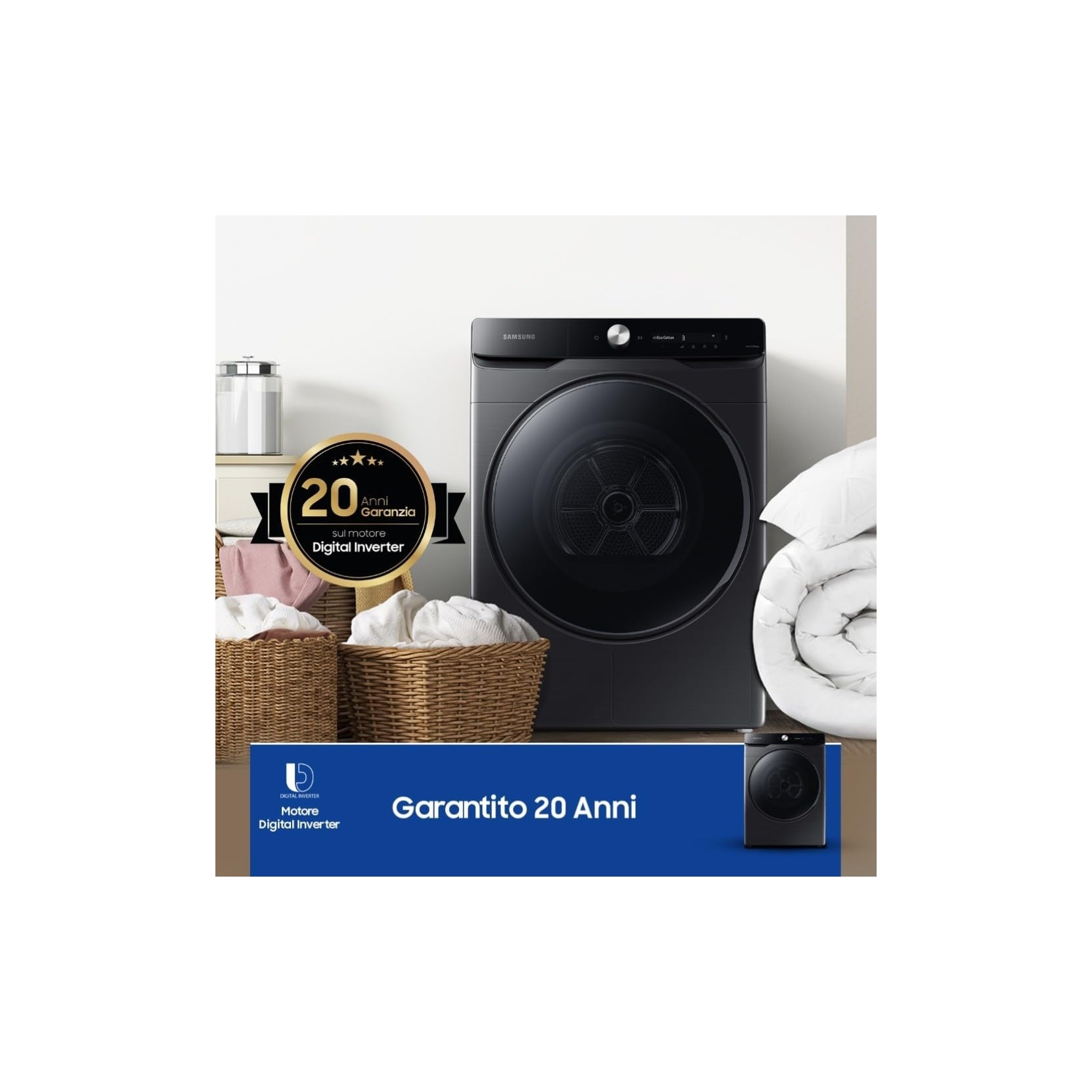 La Samsung DV16DG8600BVU3 è una asciugatrice moderna e potente pensata per **famiglie numerose e carichi di grandi dimensioni**. Grazie alla sua tecnologia di asciugatura a pompa di calore ibrida, assicura prestazioni efficienti e consumi contenuti. Le funzioni intelligenti come AI Control e AI Dry con Wi-Fi e SmartThings semplificano e ottimizzano il processo di asciugatura, suggerendo il programma più adatto e monitorando in tempo reale umidità e temperatura. Inoltre i programmi dedicati come Hygiene Care aiutano a rimuovere allergeni e batteri, ideale anche per panni sportivi o di bambini.