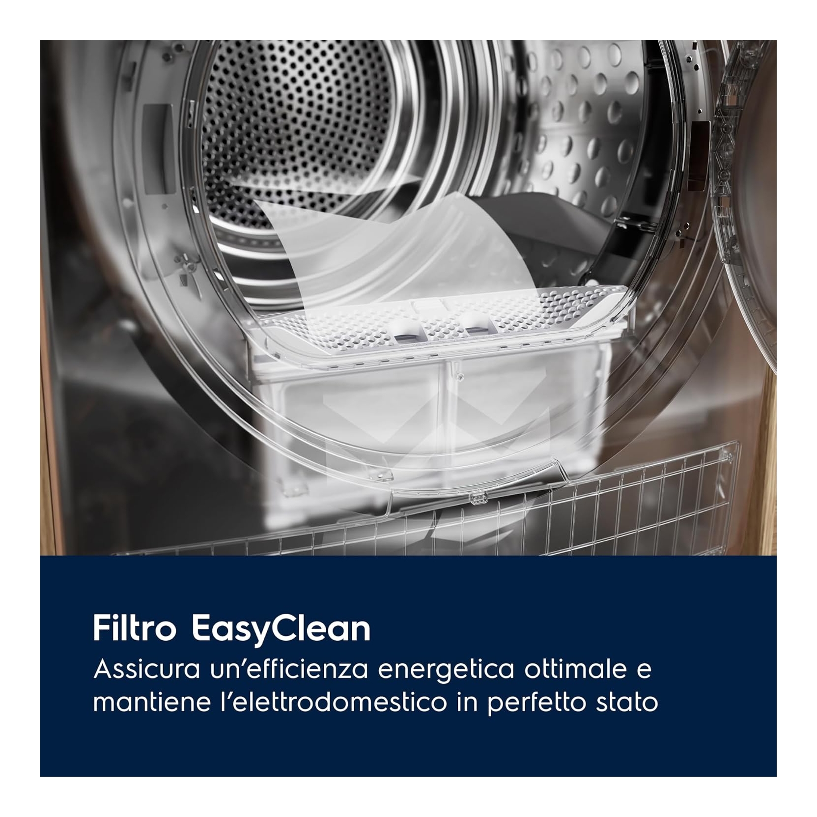 - Il filtro EasyClean va pulito regolarmente: bastano pochi gesti per rimuovere i residui e preservare l’efficienza dell’asciugatrice nel tempo.