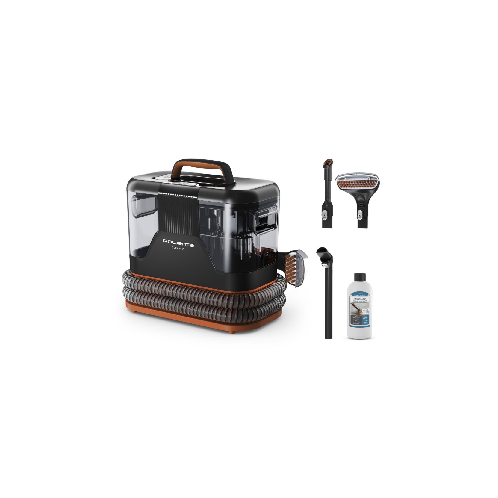 IN5011F0 Clean It di Rowenta è la soluzione perfetta per gli imprevisti e gli incidenti quotidiani: uno smacchiatore che pulisce a fondo la casa in tutta facilità, anche in presenza di animali domestici e bambini. Questo lavatappeti portatile, rapido ed efficiente, offre una pulizia multifunzione affidabile, con accessori di pulizia intercambiabili per tappeti, divani, interni dell'auto, tappezzeria, materassi e molto altro. Grazie a una gamma completa di funzionalità, scopri l'alleato perfetto per una casa sempre impeccabile