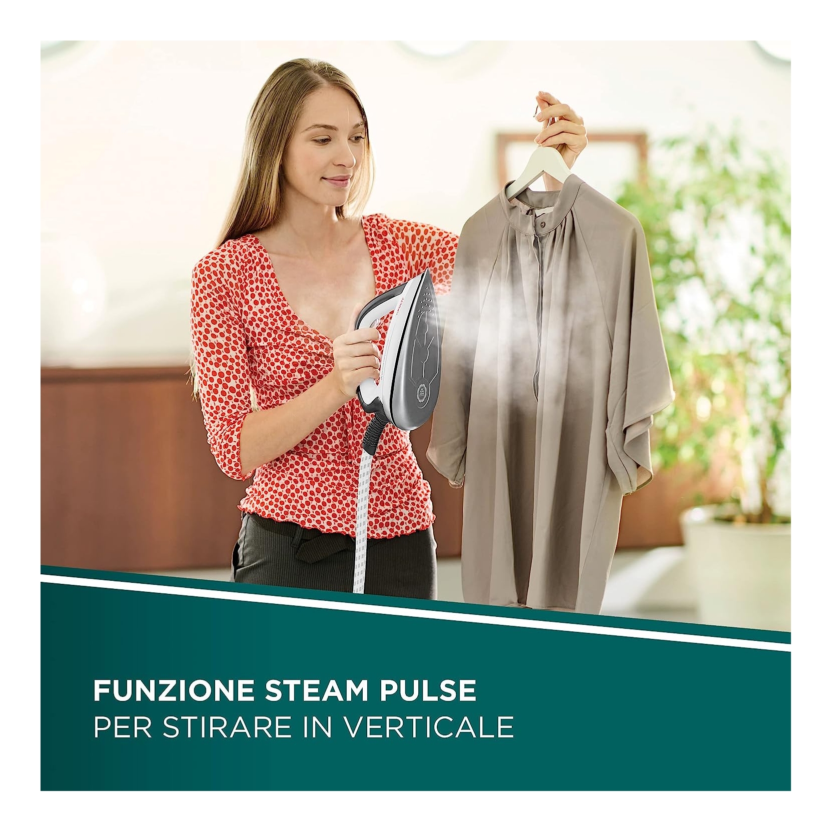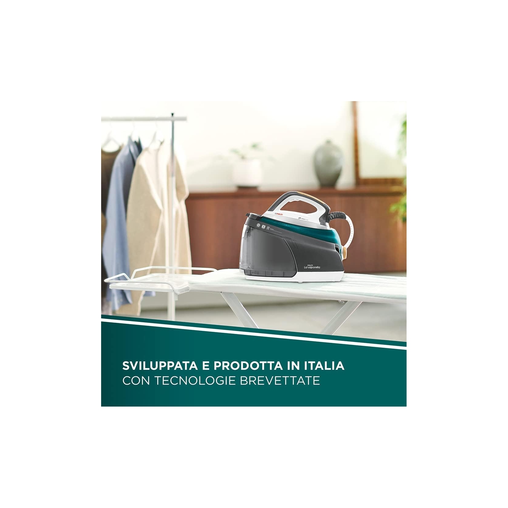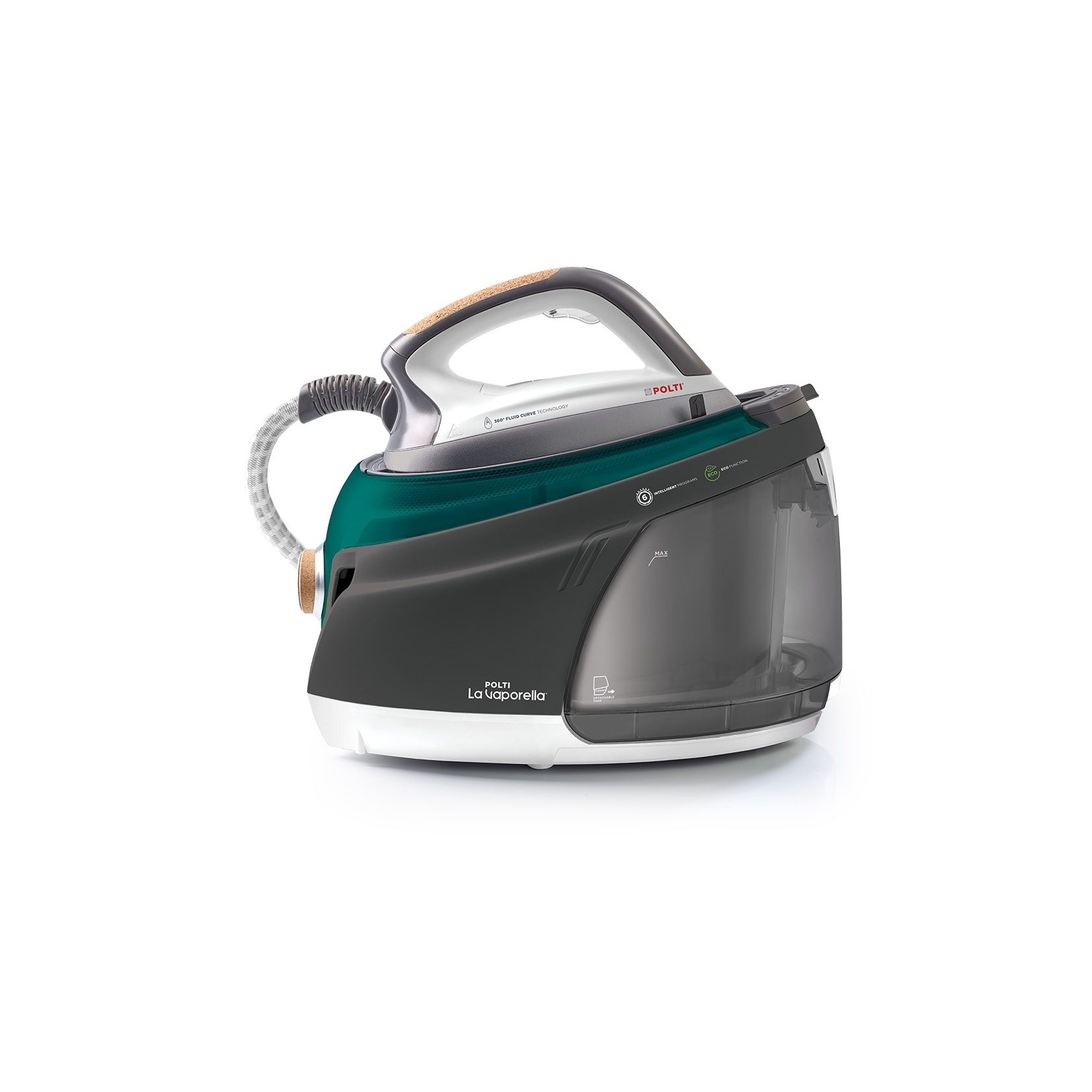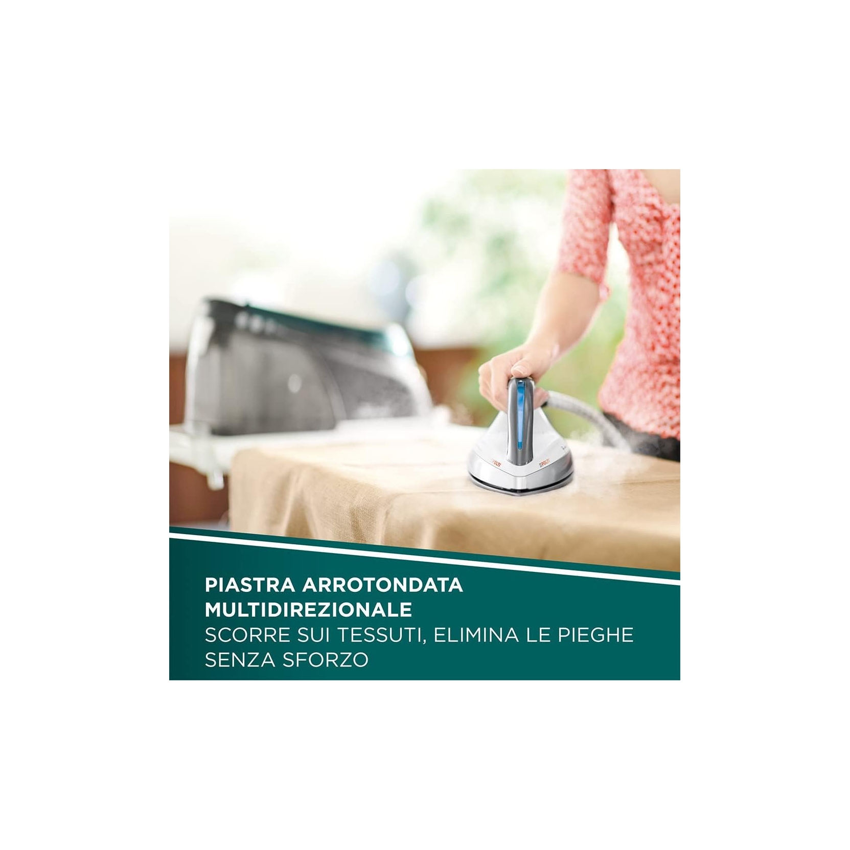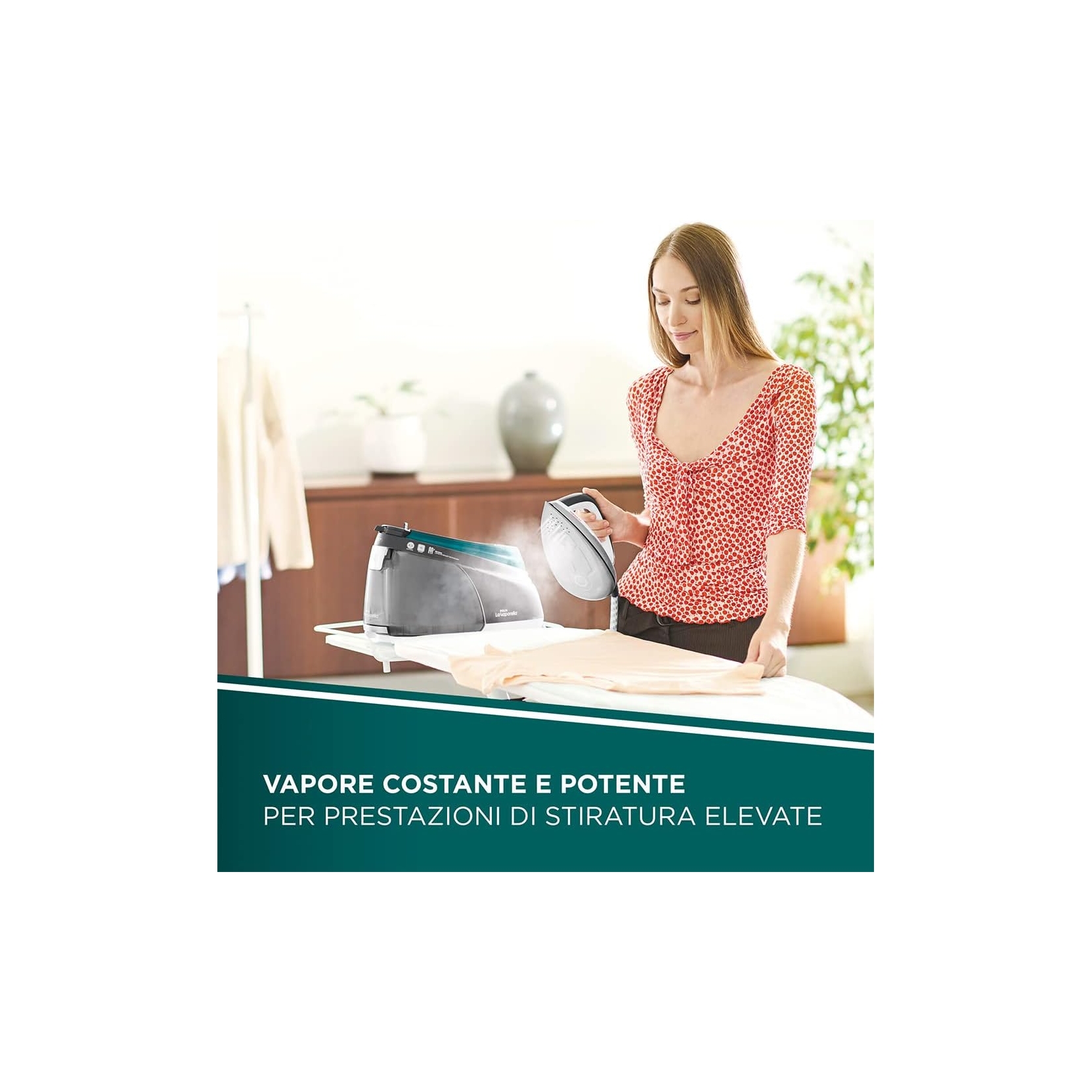 Serbatoio estraibile da 1,5 L, tappetino removibile, blocca ferro e scomparti per cavo e tubo vapore: viva la praticità!