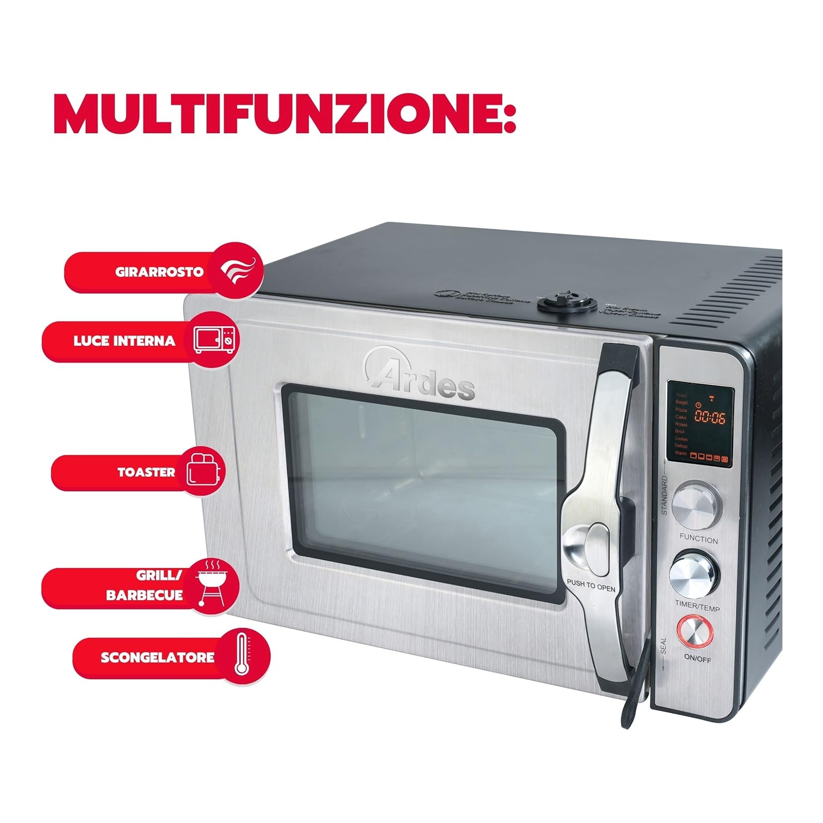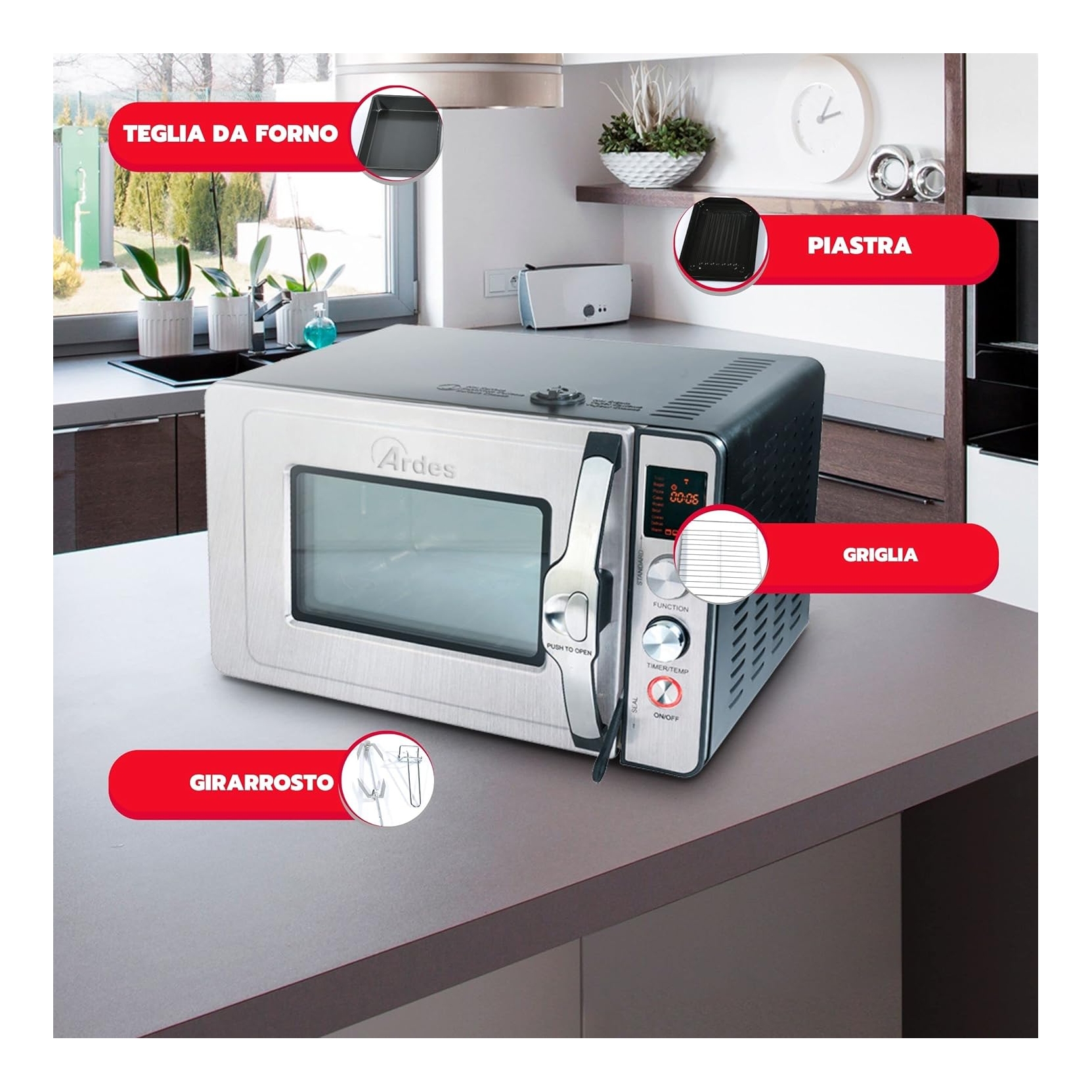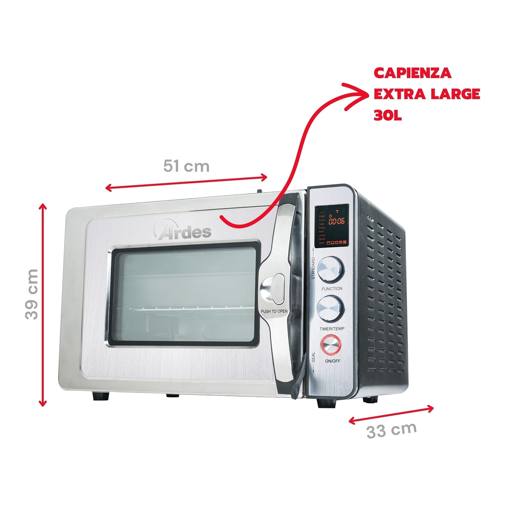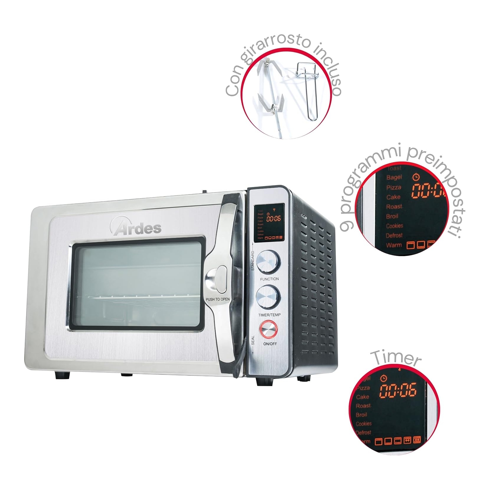 ARDES AR6430PR. Forno elettrico 2 in 1: può essere utilizzato come forno statico o in modalità ‘a pressione’ - Volume: 30 lt - Acciaio inox - Display LED digitale con indicazione della temperatura/funzione/timer. -9 programmi di cottura (toast, bagel, pizza, torta, arrosto, griglia, biscotti, scongelamento, riscaldamento) - Possibilità di selezionare direttamente le funzioni di cottura (solo sopra, solo sotto, sopra + sotto, sopra+girarrosto, sopra+sotto+girarrosto) - Con girarrosto - Timer - Temperatura regolabile da 35 a 230°C -  ZERO SPESE PAYPAL - SPEDIZIONE GRATUITA