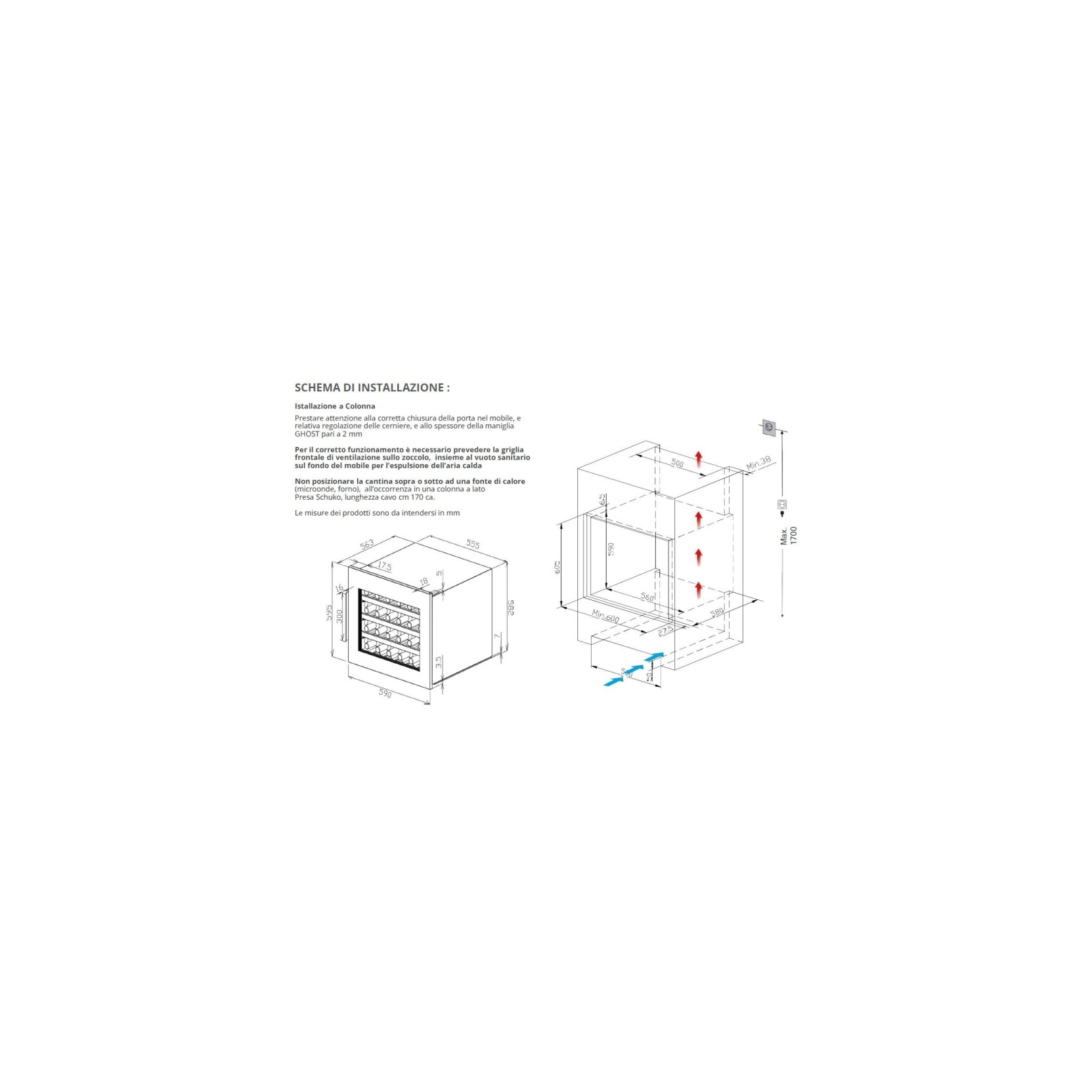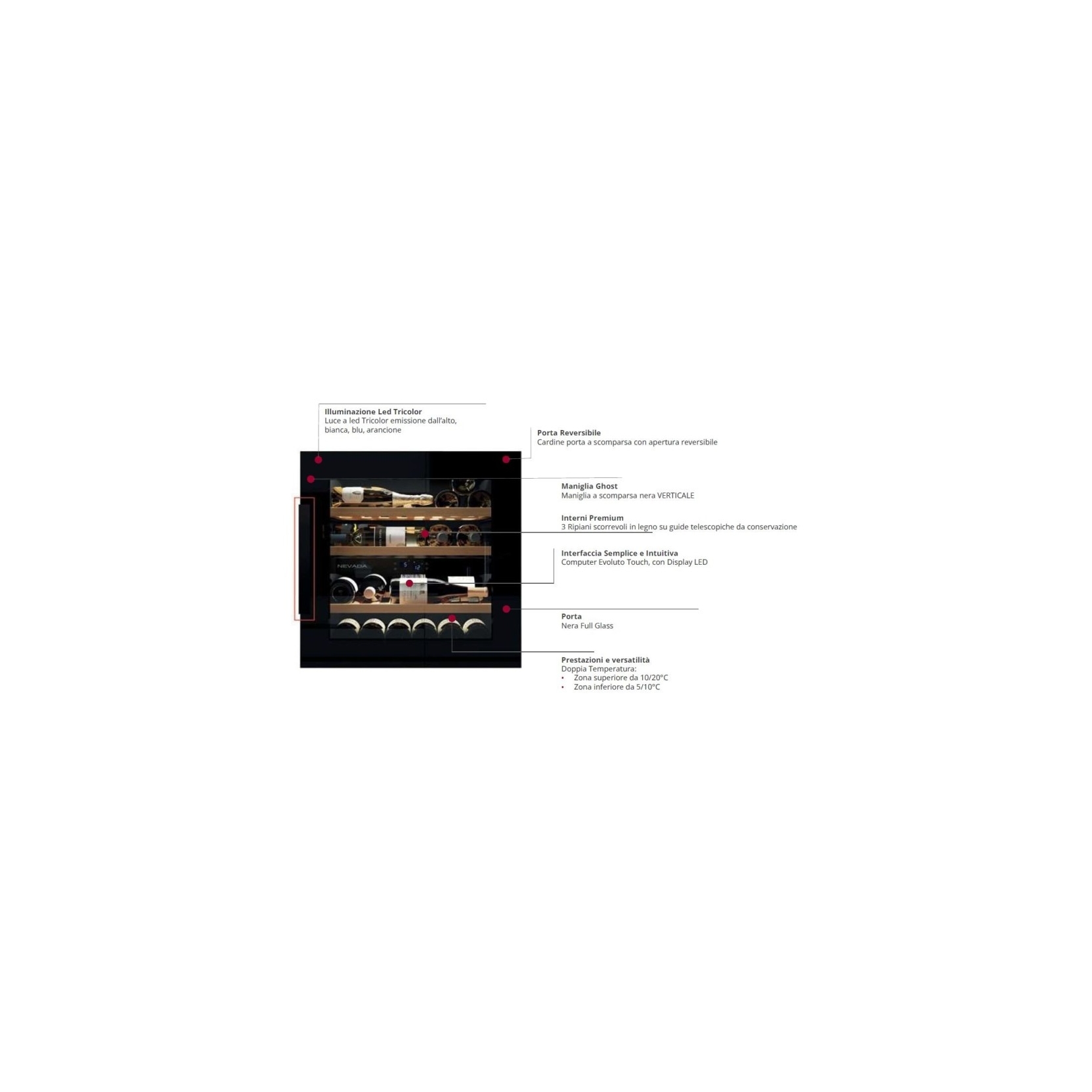 YOUWINE NW41D-BFG-H. Capacità circa 41 bottiglie (75 Cl.) – Computer evoluto, controllo soft touch – Regolazione 2 temperature da 5/10 °C – 10/20 °C – Classe energetica G – Potenza 75 W; consumo 142 KWh/anno – Filtro ai carboni attivi – Riscaldatore interno – Porta Full Glass nera – Senza maniglia (fascetta a scomparsa “Ghost”) – 3 ripiani scorrevoli in legno da conservazione – Ripiani con guide telescopiche – Luce a led Tricolor, bianca, blu, arancione – Livello sonoro 38dB – Classe Climatica N – Cardine porta destra e reversibile