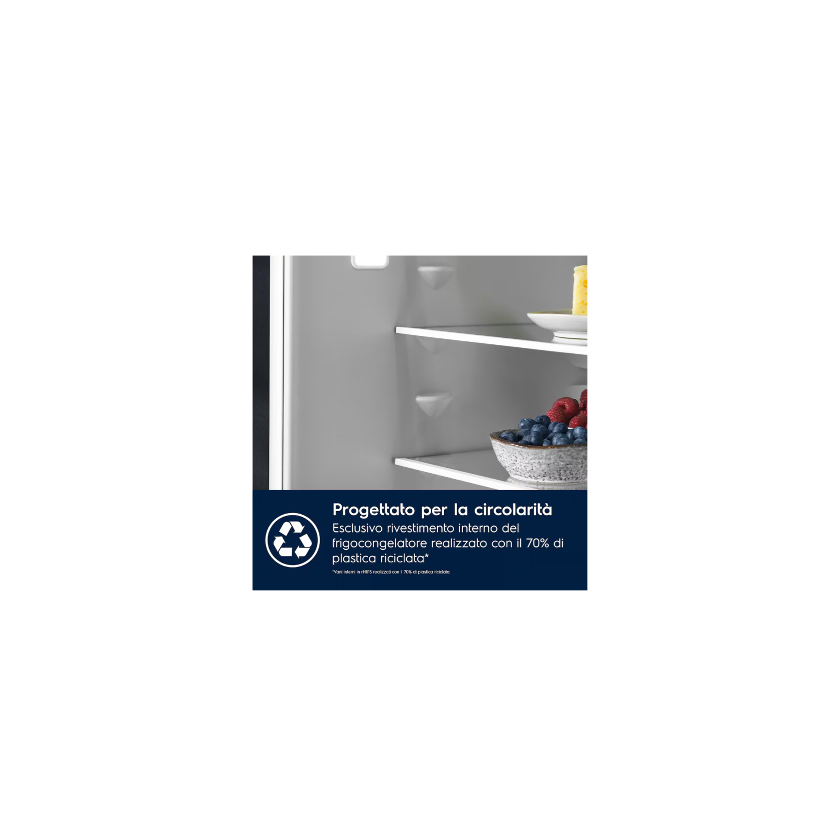 I vani interni sono realizzati con il 70% di plastica riciclata. Per produrre nuovi frigoriferi è utilizzata la plastica dei frigoriferi dismessi, contribuendo a ridurre i rifiuti attraverso una logica di circolarità.
