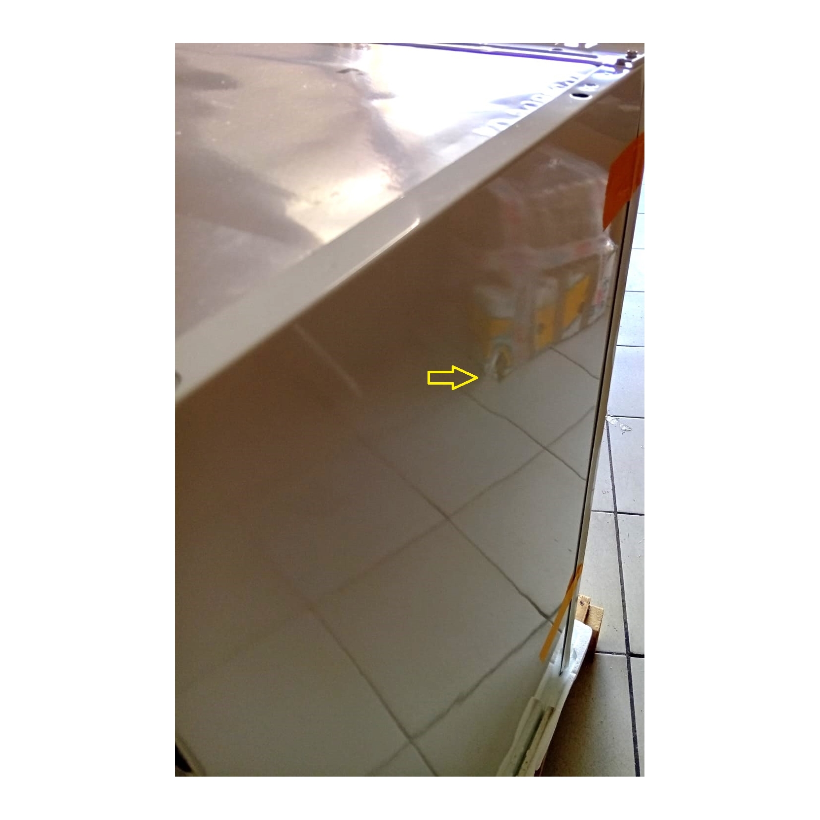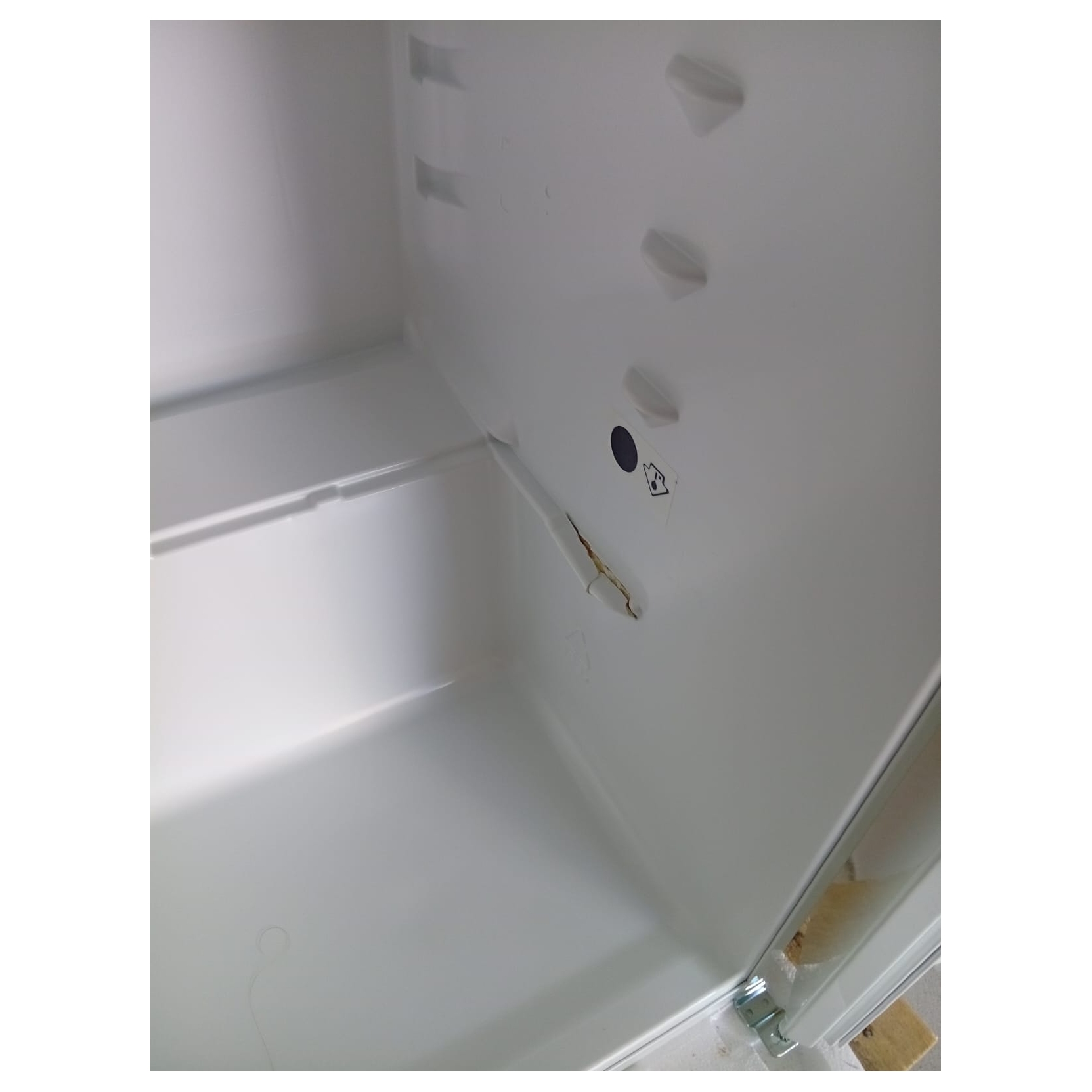 Parte interna dove poggia la mensola inferiore rovinata. Lato sinistro lievemente amamccato. ATTENZIONE: il frigo non è stato mai usato. Sono presenti dei difetti estetici che non pregiudicano il corretto funzionamento.