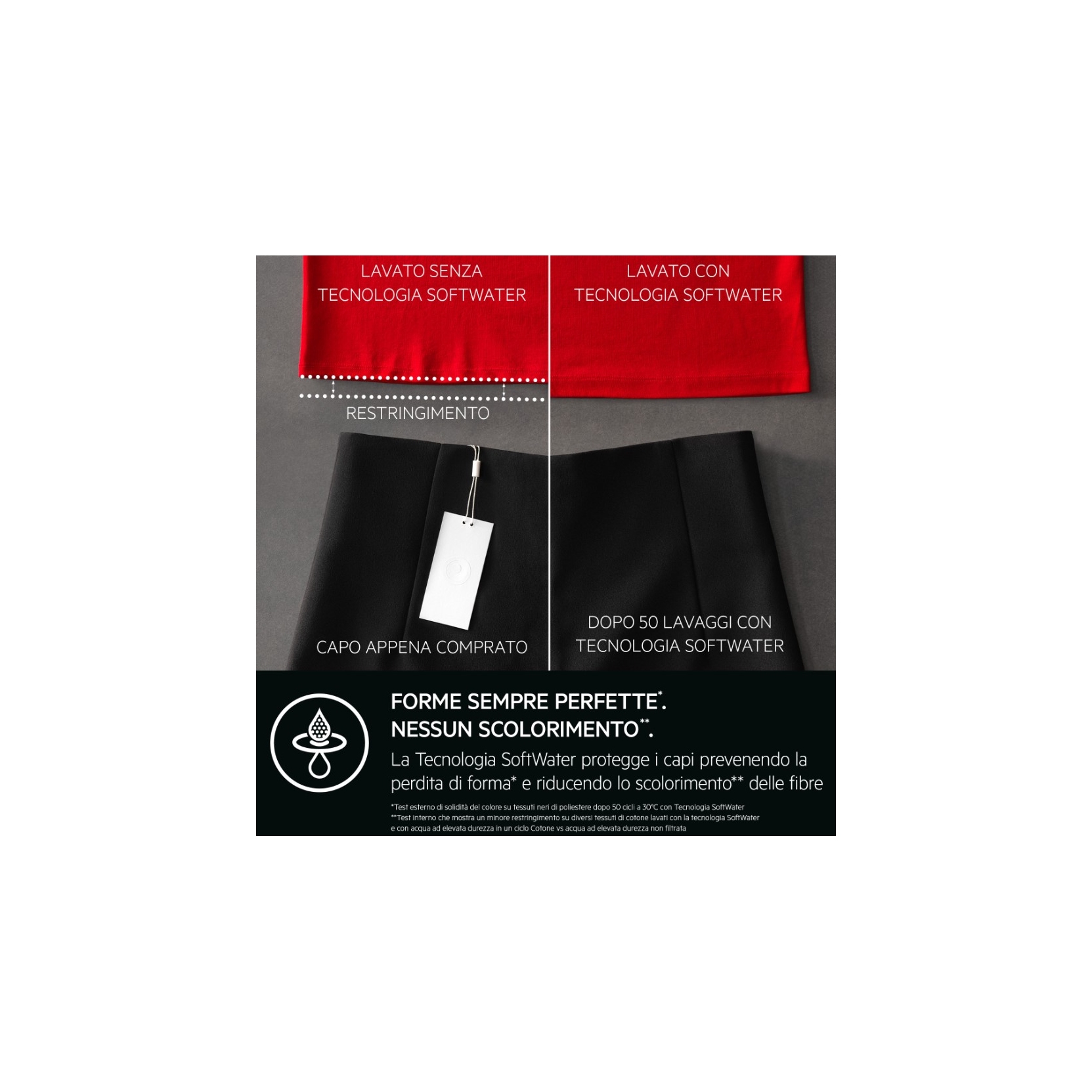 - Tecnologia SoftWater: filtra e addolcisce l’acqua per proteggere le fibre e mantenere vivi i colori