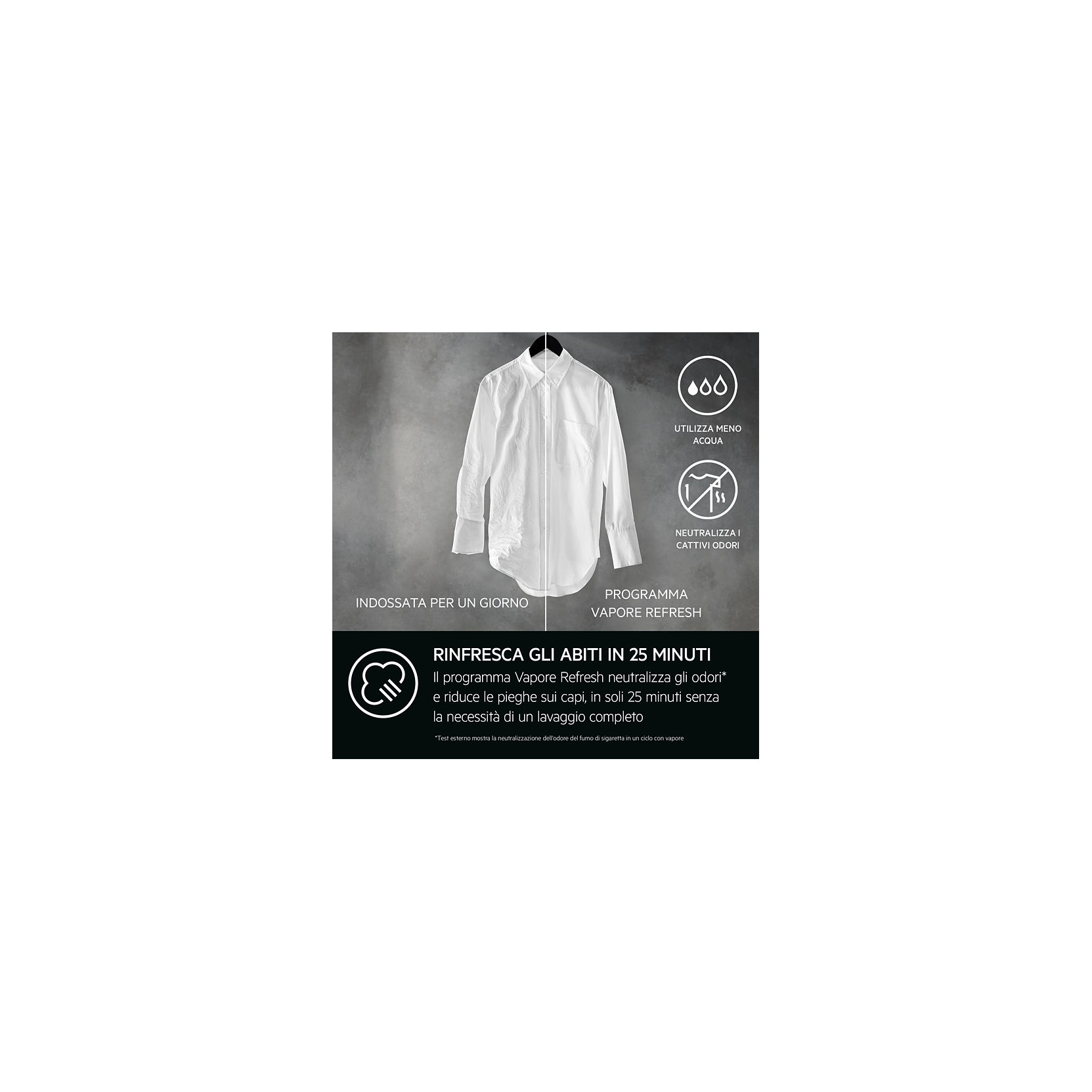 Il programma Vapore Refresh neutralizza gli odori* e riduce le pieghe sui capi, inclusi i delicati, in soli 25 minuti senza la necessità di un lavaggio completo.