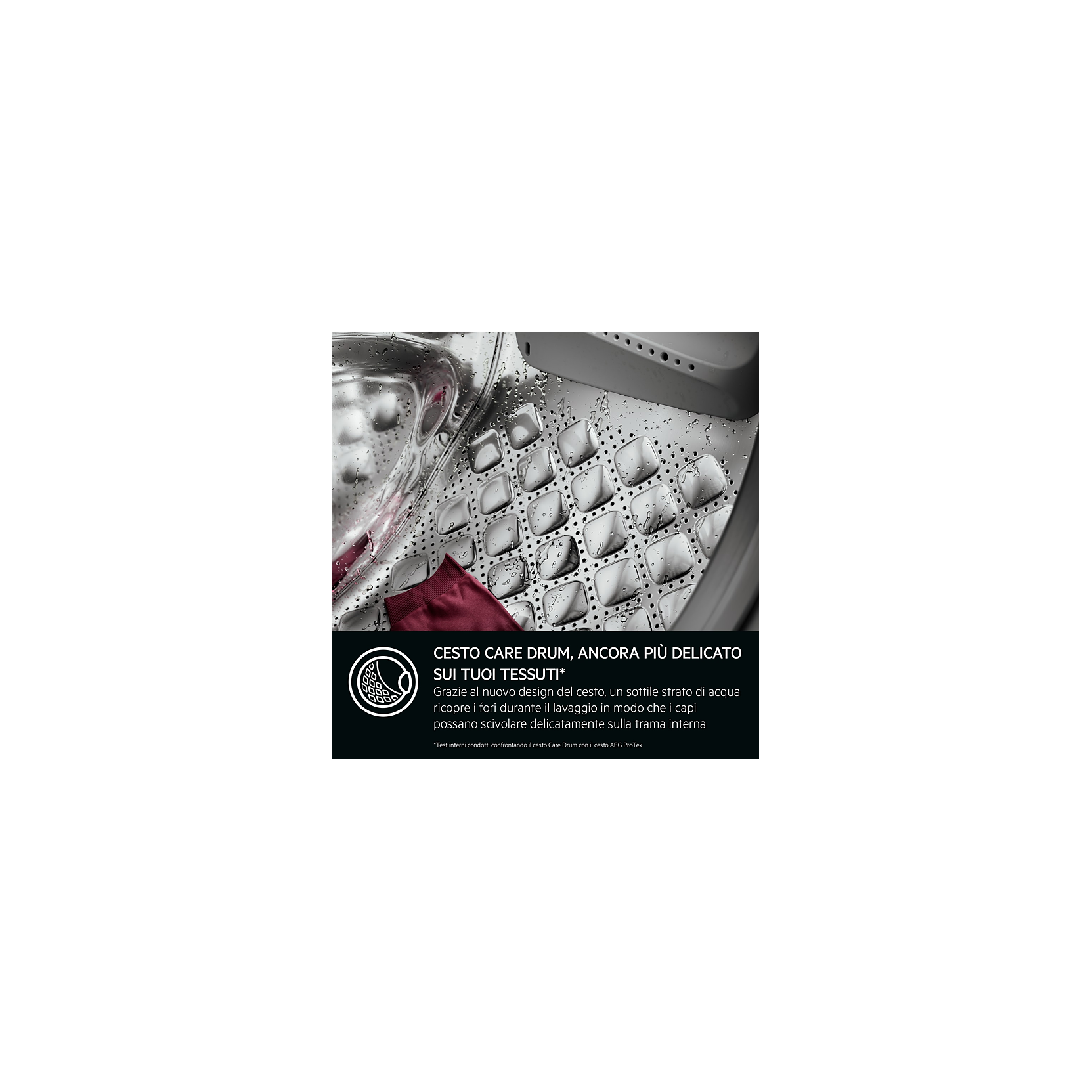 Il cesto Care Drum permette ai capi di scivolare delicamente sulla trama interna, mentre un sottile strato di acqua ricopre i fori, così da ridurre lo sfregamento e l'usura dei tessuti. Non solo assicura straordinarie prestazioni di lavaggio ma garantisce una cura ancora più delicata