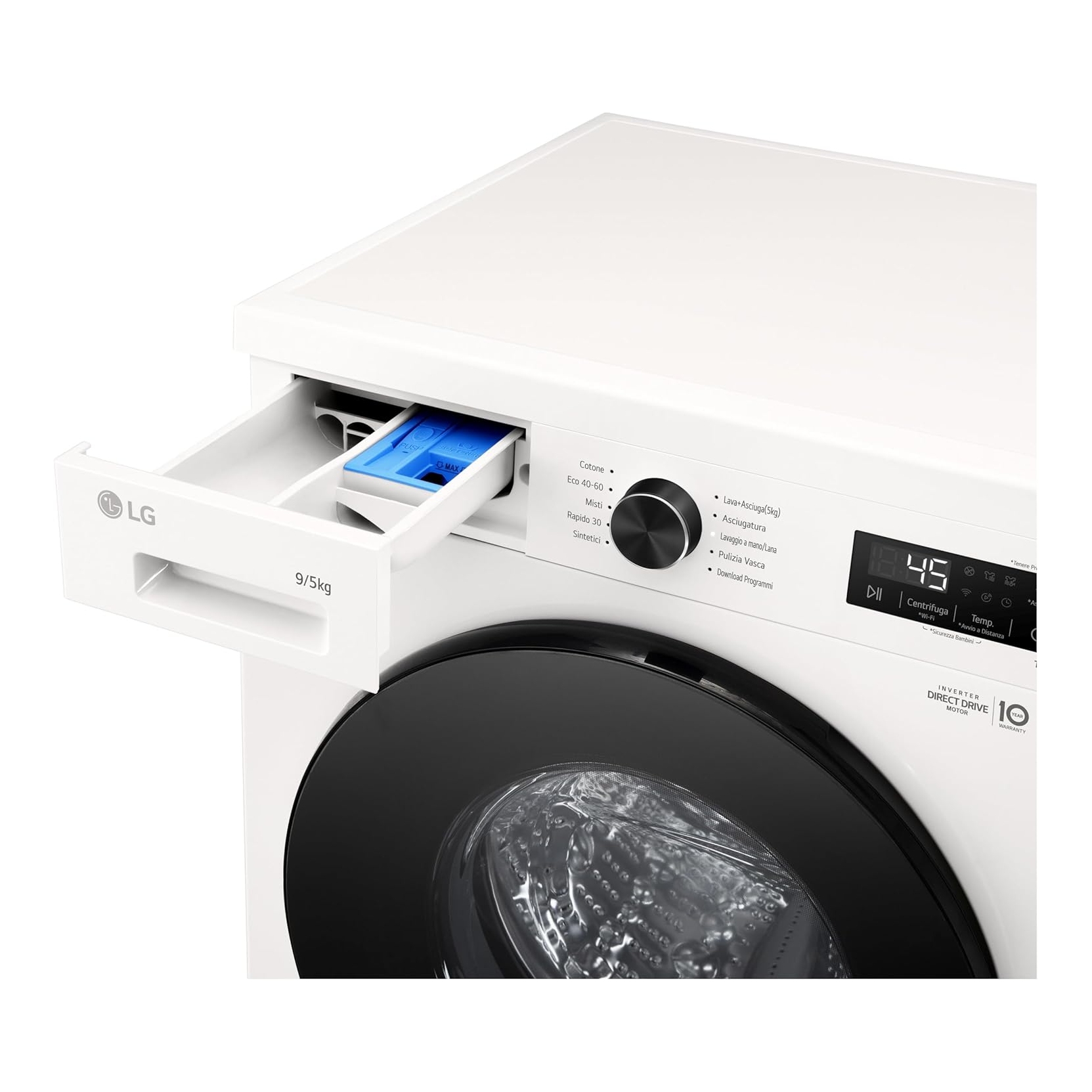 Lg W4NX1085NWB. Lavasciuga a Libera installazione - Capacità di lavaggio: 9 kg - Capacità di asciugatura: 5kg - Centrifuga: 1400 giri/min - Serie X1 - Classe energetica di lavaggio: A - Classe energetica lavaggio + asciugatura: E - 6 Motion Direct Drive: lava come le tue mani grazie ai 6 movimenti precisi del cestello, migliorando la qualità del lavaggio - Wi-Fi con ThinQ: gestisci la lavasciuga da remoto - Top rimovibile: una lavasciuga che si adatta a tutti gli spazi grazie al pannello di copertura rimovibile che ti permette di incassarla sottopiano - ZERO SPESE PAYAPAL - SPEDIZIONE GRATUITA