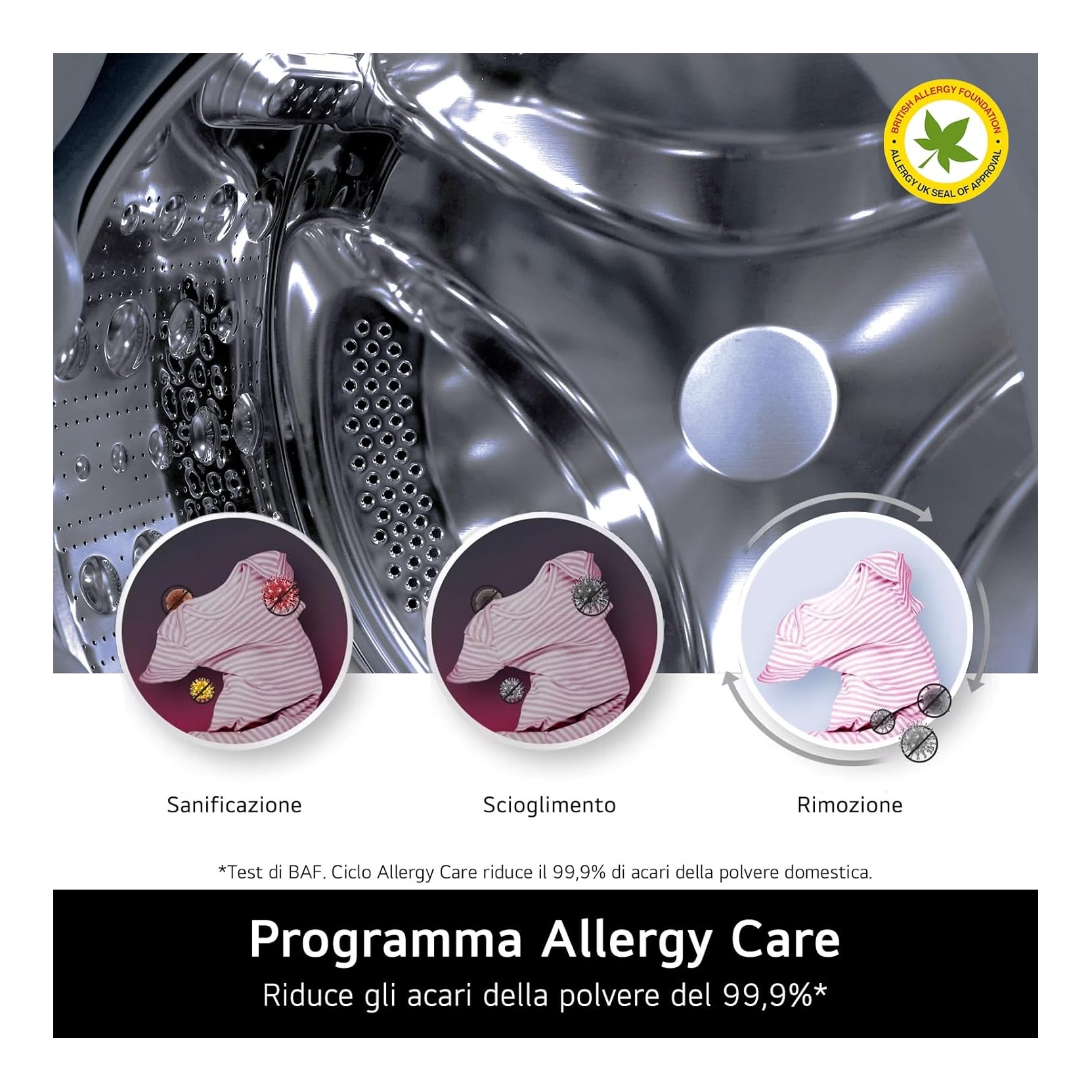 - Lavaggio a vapore “Allergy Care”: funzione vapore che elimina allergeni, batteri, germi e migliora cura dei tessuti