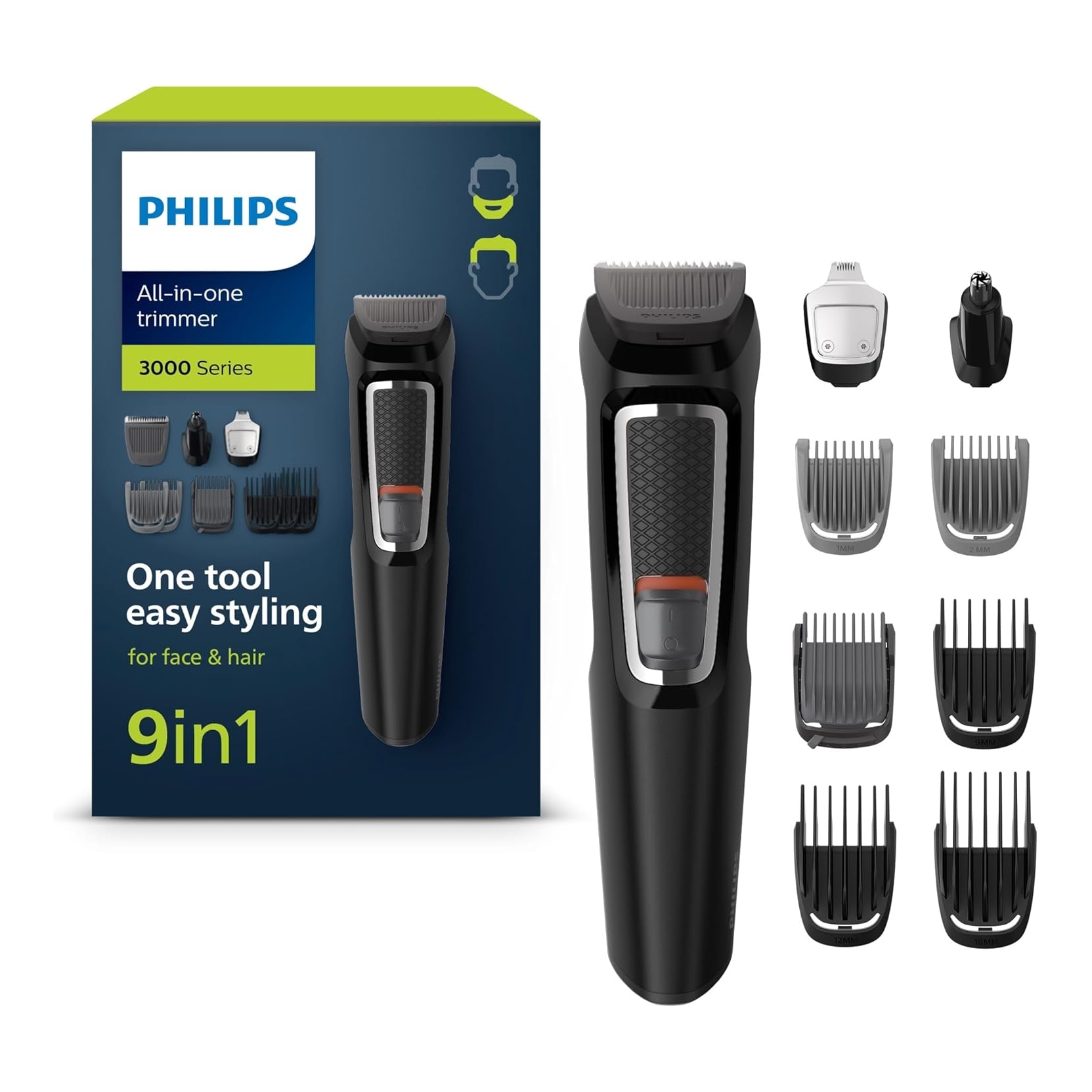 PHILIPS MG3740/15. Rifinitore ricaricabile per barba/baffi e naso/orecchie - Autonomia 60 min. - Multigroom 9 in 1 - Lame in acciaio temperato autoaffilanti che non si rompono, non si smussano né arrugginiscono - Accessori: Rifinitore di precisione in metallo Rifinitore per naso e orecchie Pettine per barba regolabile da 3 a 7 mm 2 pettini per barba di 3 giorni 3 pettini per capelli - ZERO SPESE PAYPAL - SPEDIZIONE GRATUITA