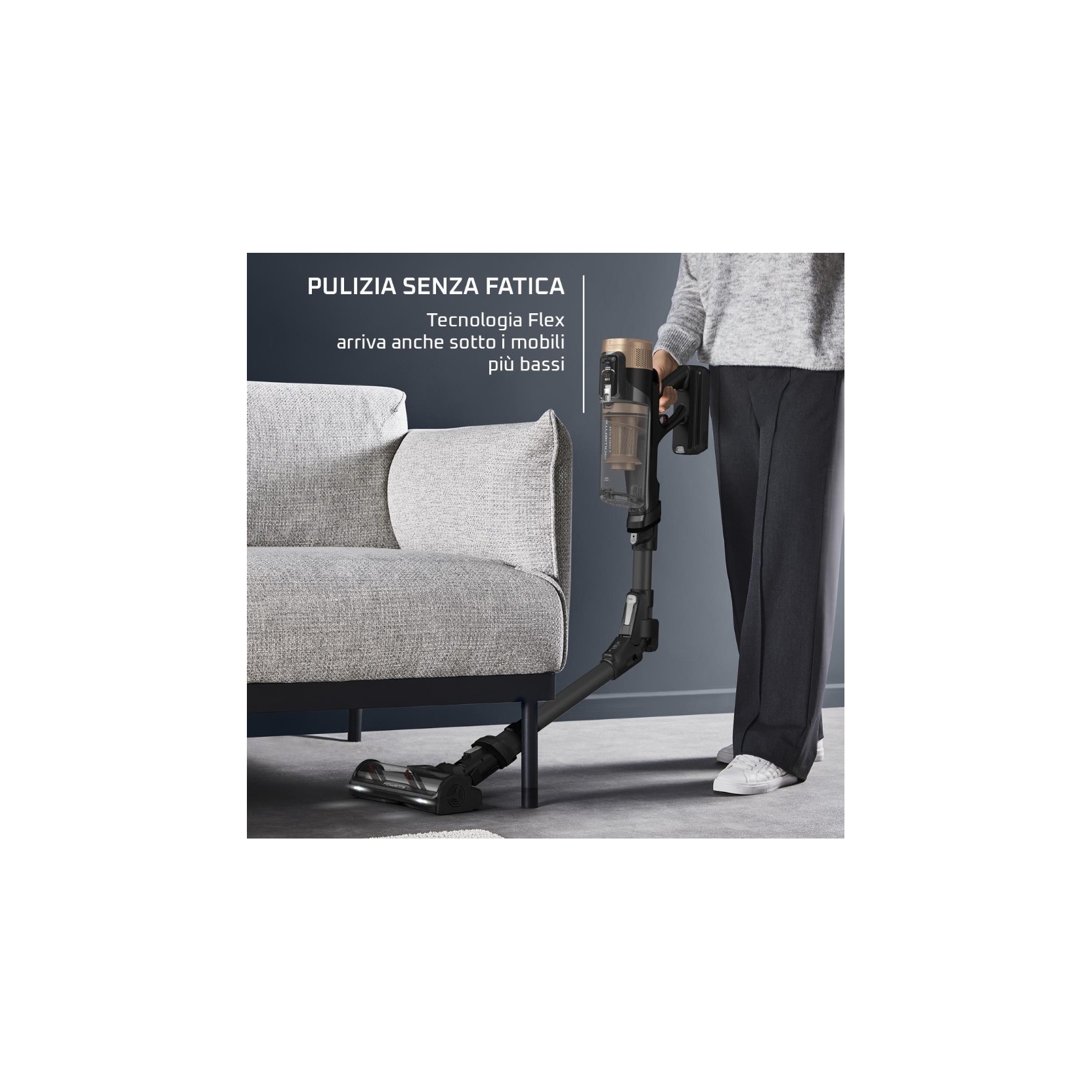 Il Rowenta X‑Force Flex 14.80 Animal Care (RH9B74WO) è l’aspirapolvere cordless pensato per le case con animali: potente (fino a 240 Air Watt in modalità Boost), autonomia notevole fino a 1 ora e 30 minuti in modalità Eco/aspirabriciole, spazzola turbo LED per catturare peli di animali anche su divani e imbottiti. Contenitore da 0,6 L, peso ridotto in modalità portatile, design elegante nero e oro, batteria removibile, display LED per il controllo dell’autonomia residua e della potenza. Perfetto per pulire tappeti, pavimenti duri, divani e zone difficili grazie agli accessori inclusi.