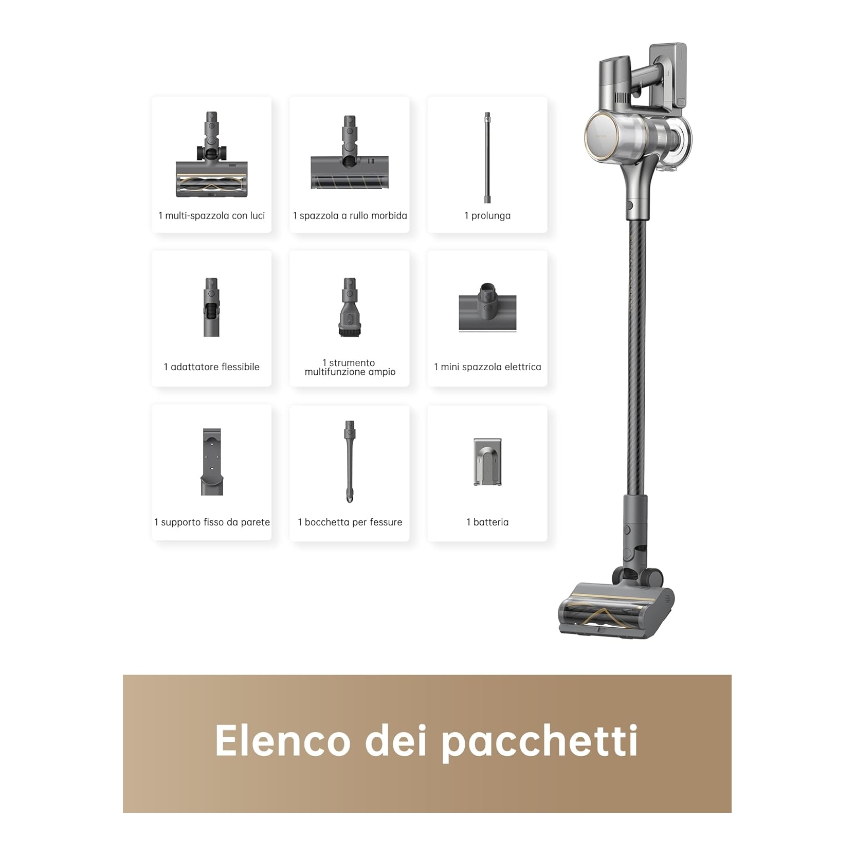 - 🔧 Accessori inclusi: spazzola multi-superficie, rullo morbido, mini-spazzola motorizzata, ugello fessure, adattatore flessibile, staffa muro.