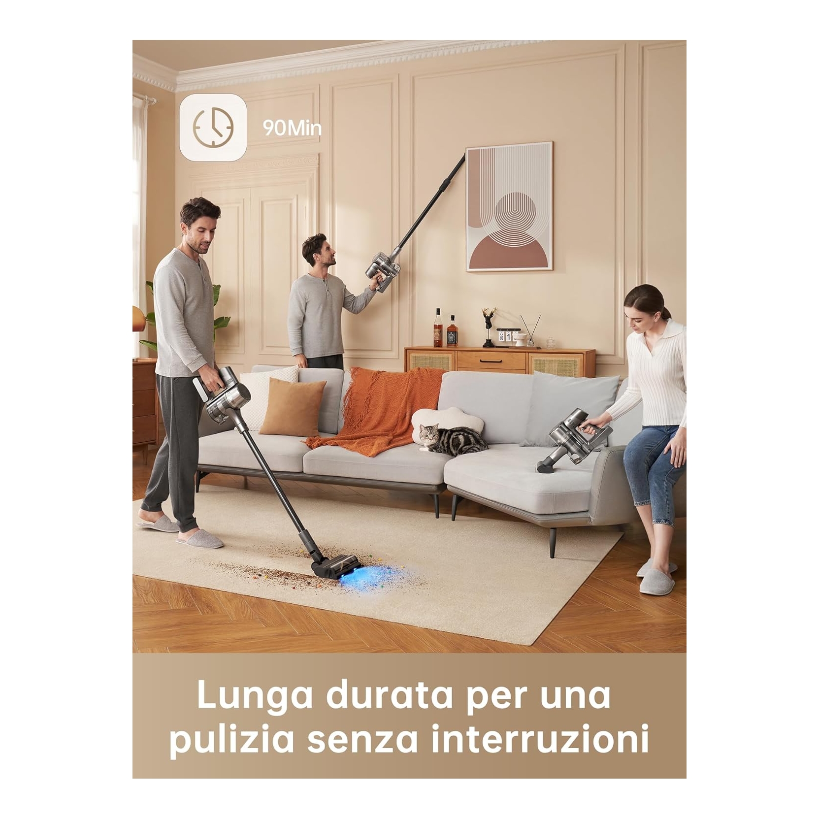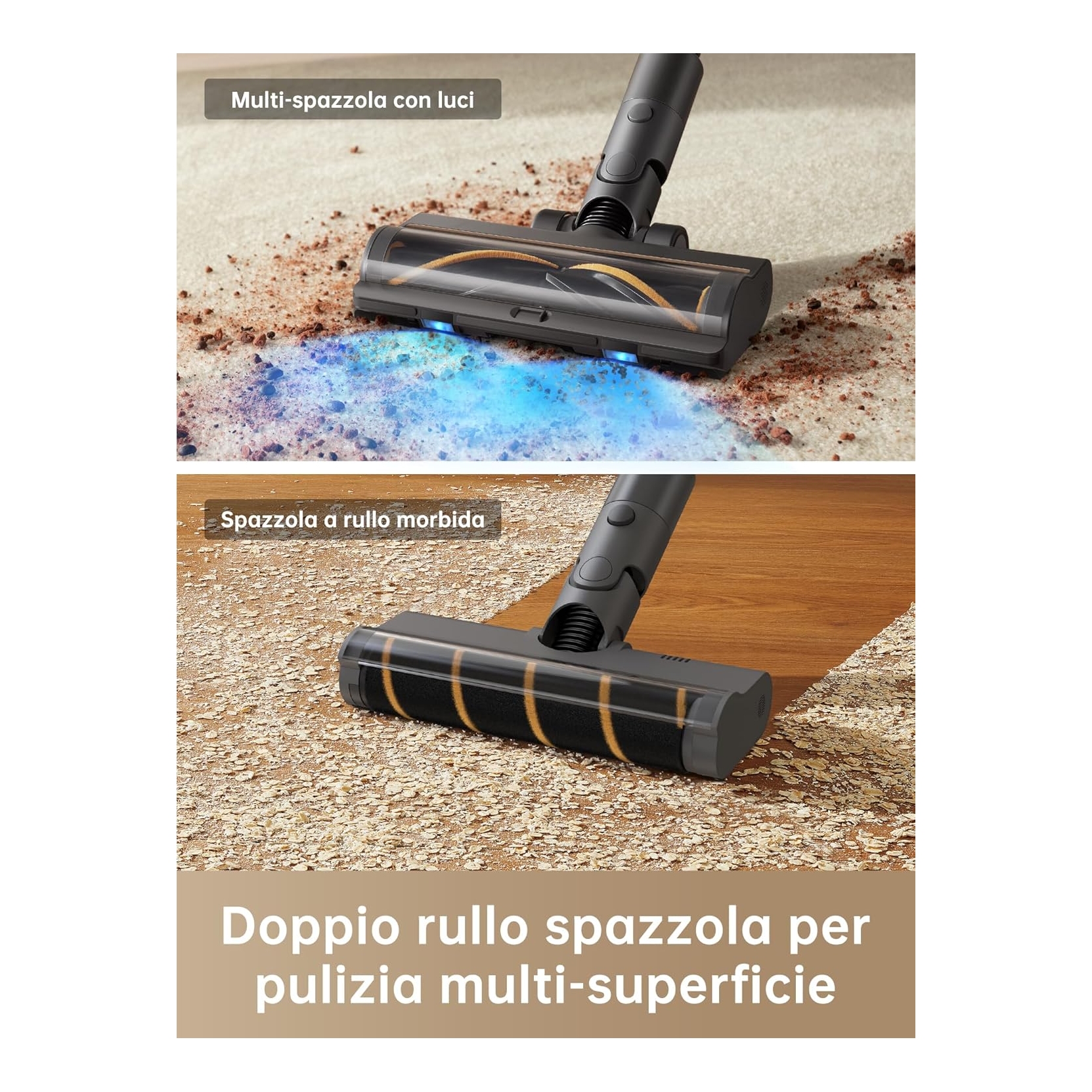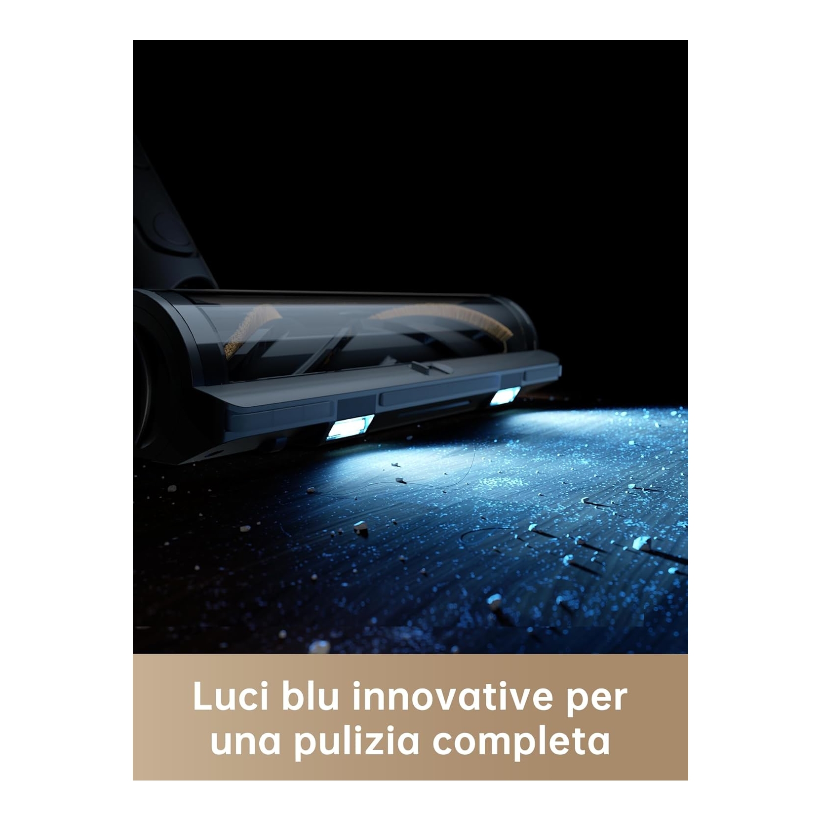 DREAME R20. Scopa elettrica Ricaricabile - Potenza max 570 W - - Regolazione elettronica - Capienza 0,6 Lt - Autonomia 90 minuti - Filtro HEPA - Con indicatore tanica piena - Con aspirabriciole - Luce LED blu che illumina le aree poco illuminate e garantisce una pulizia accurata anche nei punti più difficili da raggiungere - Minispazzola motorizzata specializzata perfetta per rimuovere i peli di animali domestici dai mobili e affrontare la polvere in ogni angolo della casa - Pulizia accurata grazie all'ampio strumento combinato, alla bocchetta pieghevole, all'adattatore flessibile e alla mini-spazzola motorizzata, che consentono di pulire diverse superfici e di raggiungere senza fatica gli spazi più ristretti - Leggero e silenzioso - ZERO SPESE PAYPAL - SPEDIZIONE GRATUITA