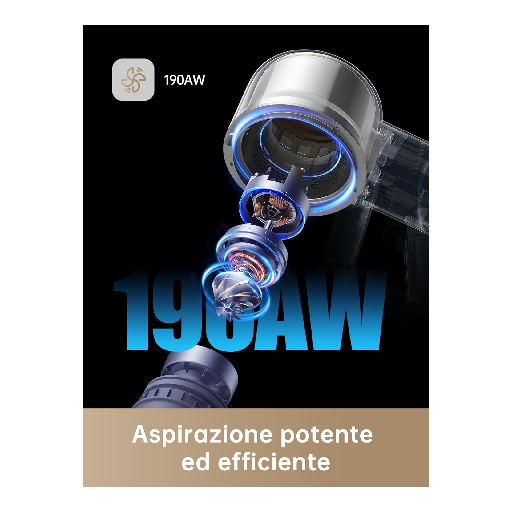 - 🔋 Potenza di aspirazione 190 AW grazie al motore brushless da 150.000 giri/min.