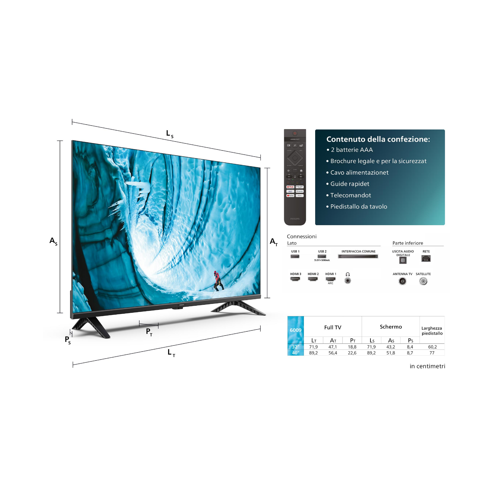 PHILIPS 40PFS6000/12. Smart TV LED 40" - Full HD - Con Full Internet TV - 3 HDMI - 60 Hz - WiFi Ready + Ethernet - Sintonizzatore DVB-T2 HEVC Main10 - Con sintonizzatore DVB-S2 - Dolby Atmos - Con Common Interface - Certificato LaTivu - Classe energetica D - Con Incredible Surround - ZERO SPESE PAYPAL - SPEDIZIONE GRATUITA